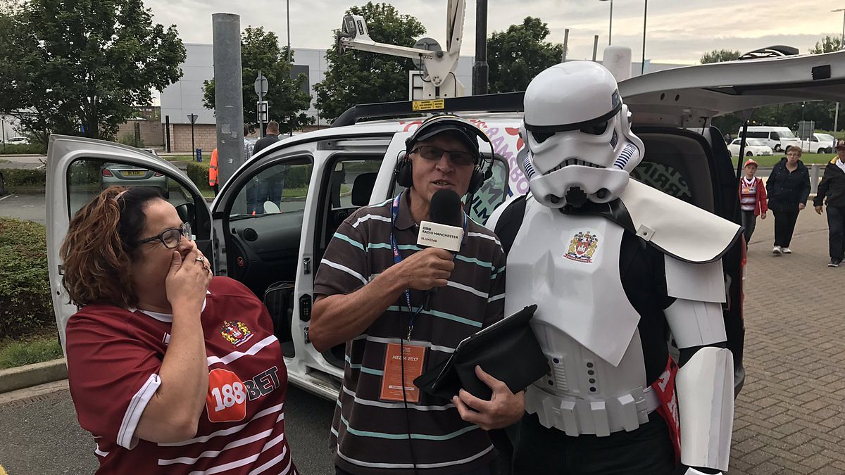 Jack Dearden talks to a Star Wars stormtrooper who supports Wigan Warriors.