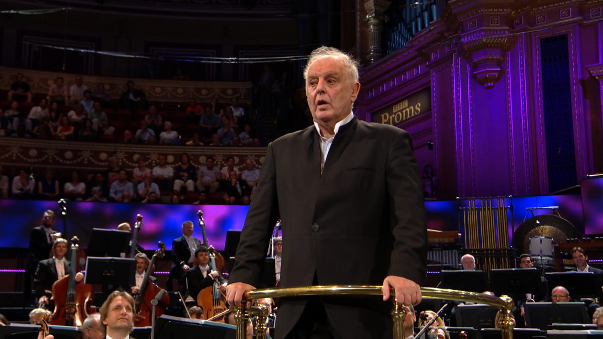 Daniel Barenboim addresses the audience before conducting the Staatskapelle Berlin in Elgar's Pomp and Circumstance March No. 1 in D major ("Land of Hope and Glory").