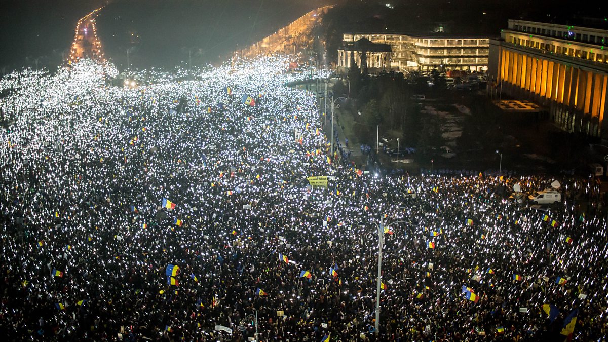 Main Image: Lights from mobile phones in Bucharest on February, 2017. Credit: ANDREI PUNGOVSCHI / AFP / Getty Images )