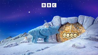 It’s a very cold day, and Mother Clanger is shivering. The rain she was hoping for falls as snow on her garden. The Iron Chicken is also feeling the cold, and flies down to ask Tiny and Small if she can stay with the Clangers in their cosy living cave.