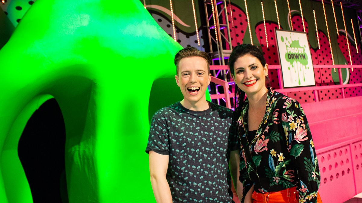 Mirain a Gareth sy'n cadw trefn wrth i ddau dîm chwarae gemau snotlyd a swnllyd! Mirain...