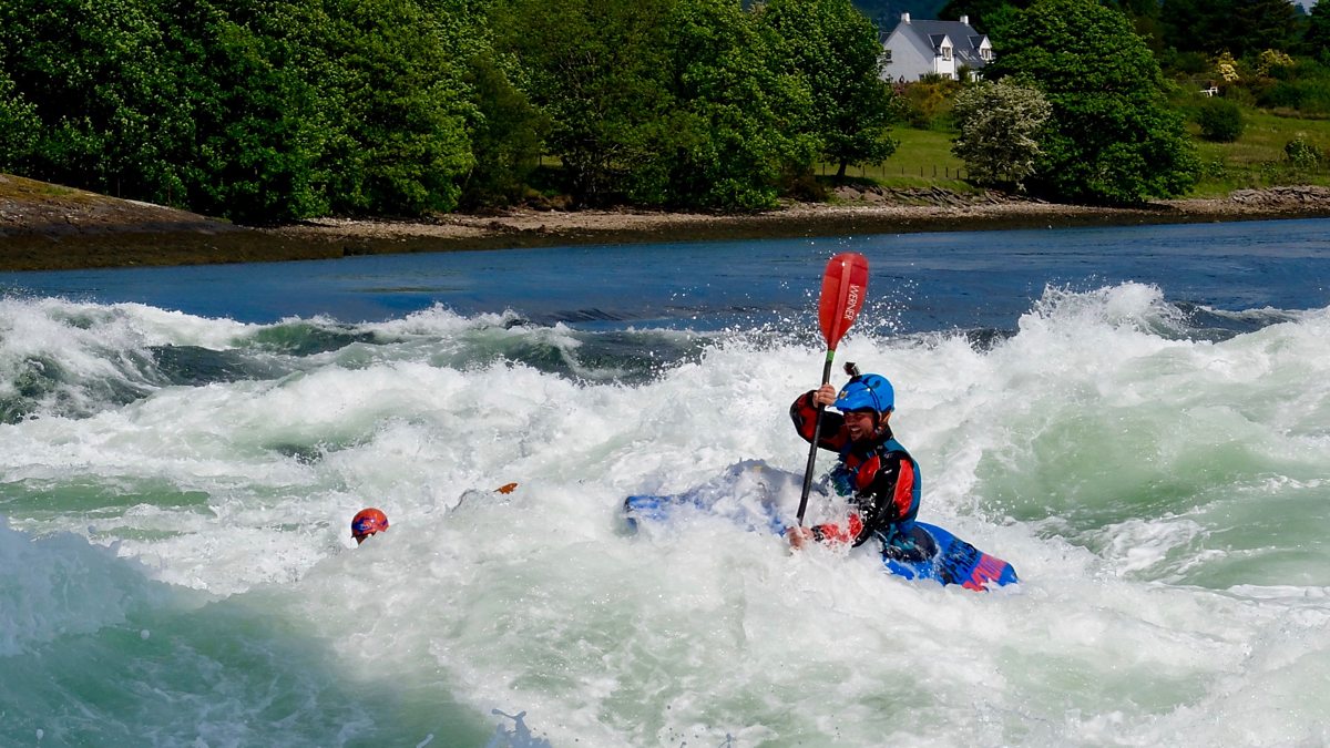 Kayakers revel in the Falls of Lora and ride a three-metre standing wave