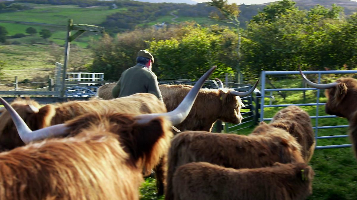 Crofter Robin Calvert helps vet Paul run bovine TB tests on his fold of Highland cattle