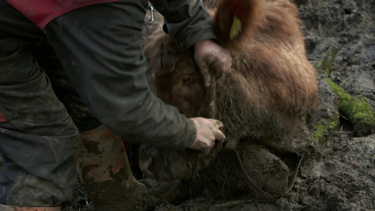 A cow has got stuck in the mud by the river. David helps out, but, will the cow make it?