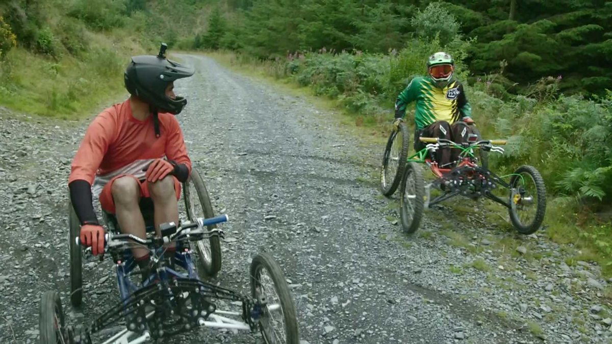 Richard Parks tries out gravity biking, a mixture of downhill mountain biking and rallying. His companion is Phil Hall who pioneered the sport.