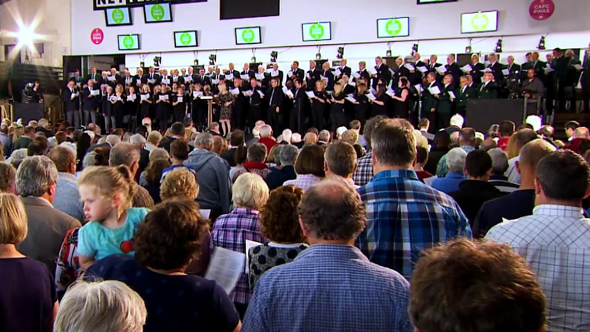 Congregation at the Royal Welsh Agricultural Show sing Love Divine from the showground shearing shed.