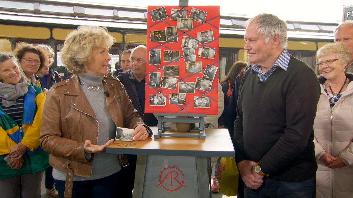 A Beatles fan shows Hilary Kay behind the scenes photos of A Hard Day’s Night, filmed at Minehead Railway Station.