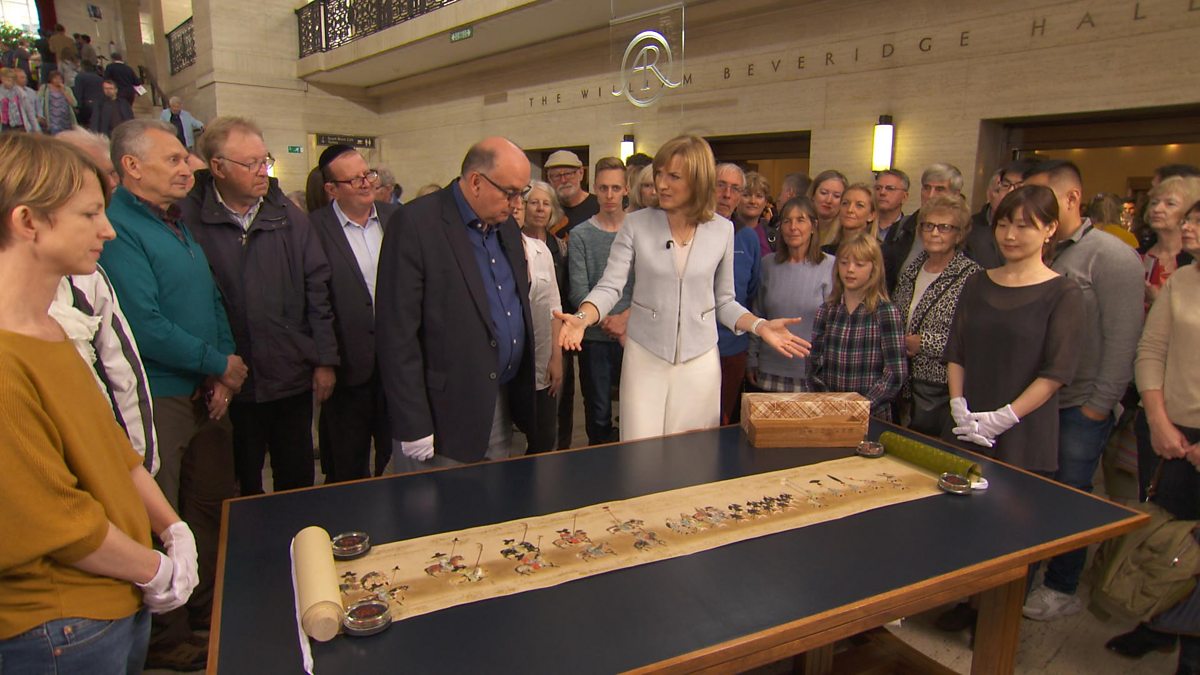 A professor from the School of Oriental and African Studies, based in Senate House, shows Fiona a remarkable 12 foot hand scroll from 1655.
