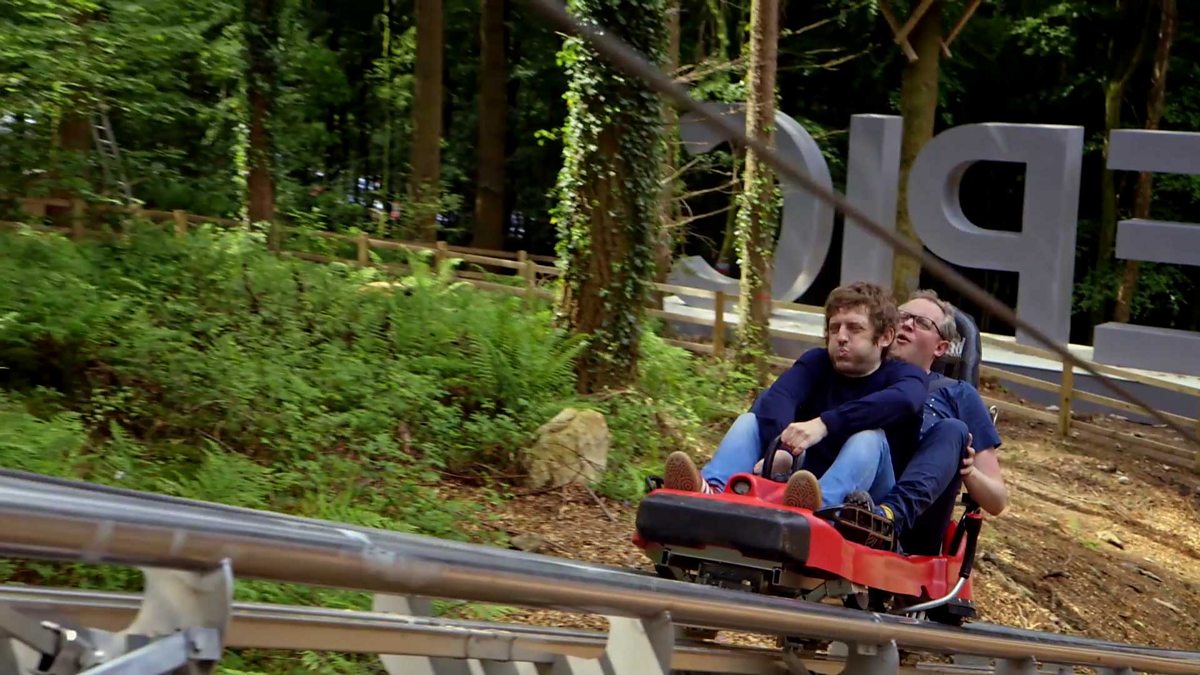 Elis and Miles get set for a trip on a brand new coaster ride through the forest near Betws-y-coed.