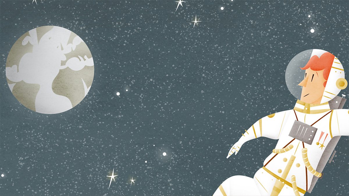 Floating in space, the Duke and Delilah gaze in wonder at planets and stars.
