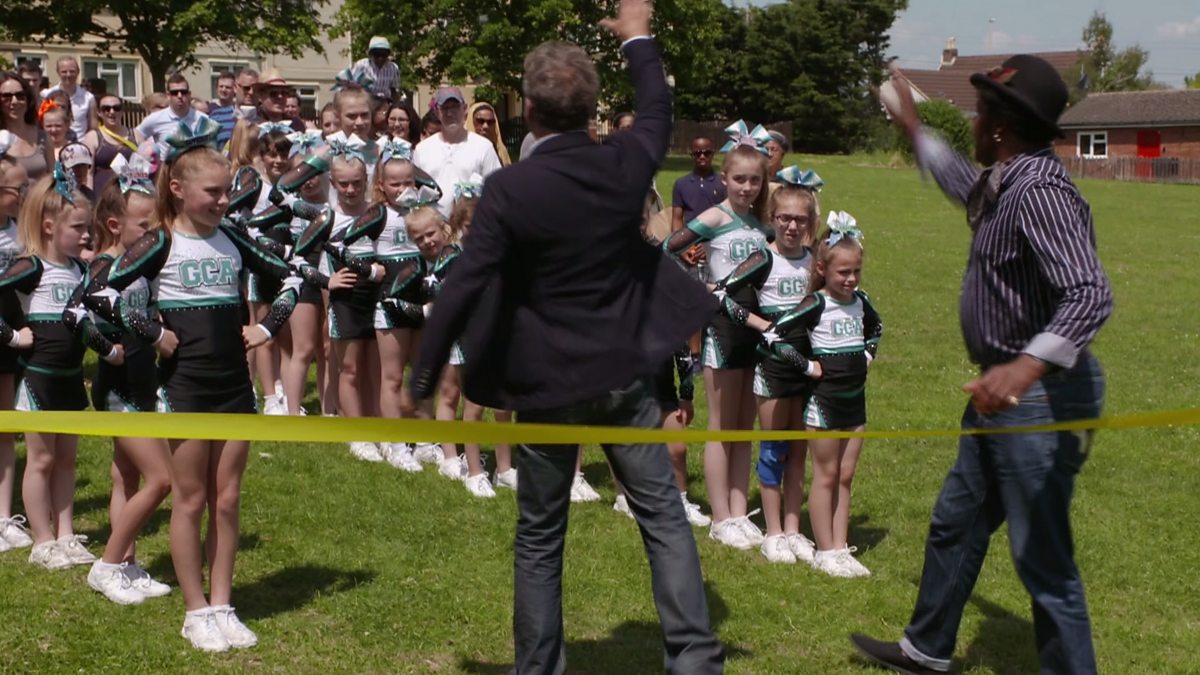 Crowds of people turn out for the grand opening of the Street Auction in Matson, Gloucester, and cheer when Paul Martin and Danny Sebastian cut the ribbon.