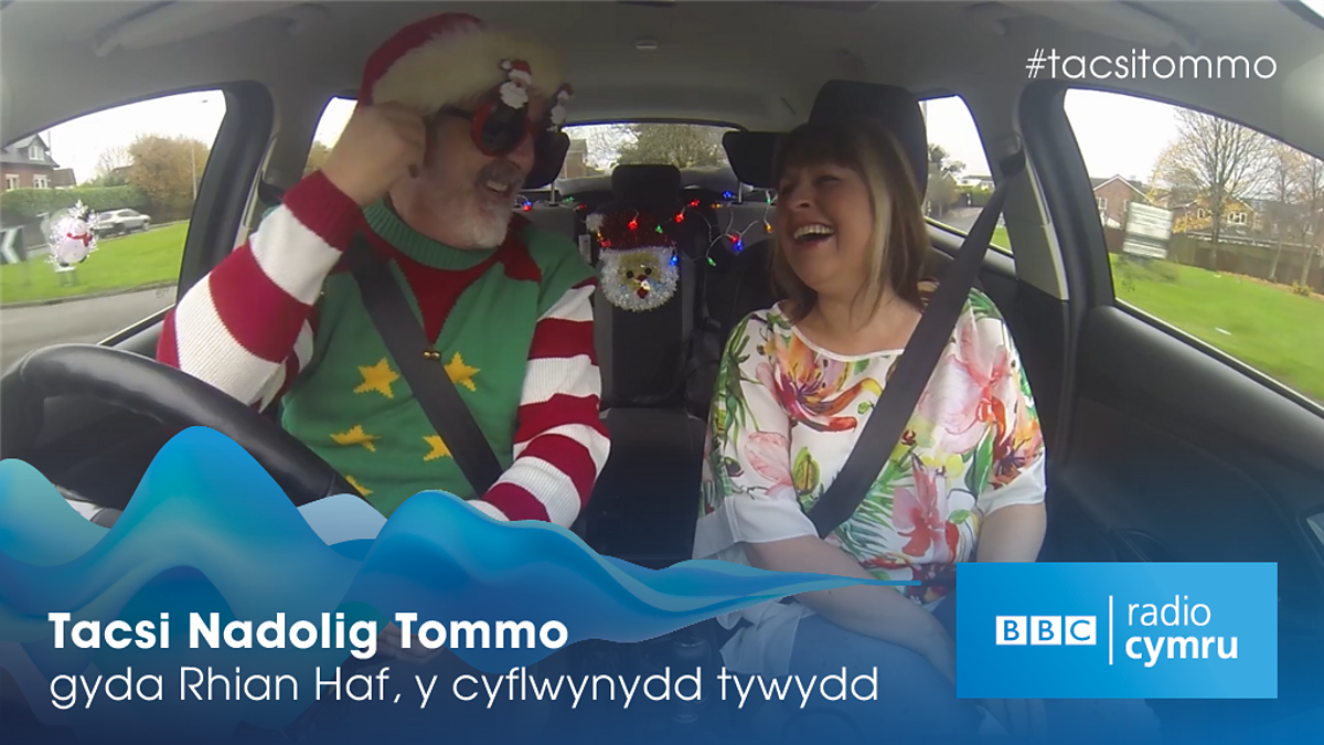 Cyflwynydd Tywydd a Theithio BBC Cymru, Rhian Haf sy'n cadw cwmni i Tommo yn y tacsi