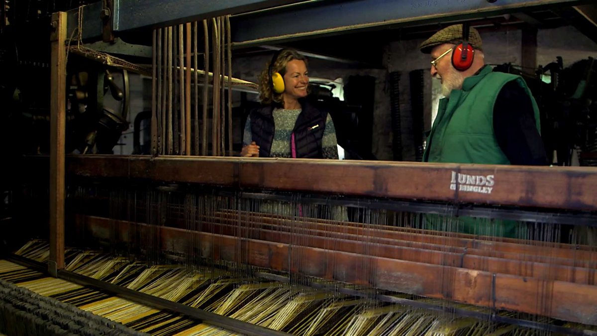 86 year old Englishman Michael Tolputt attempts to teach Kate Humble the traditional art of weaving Welsh blankets.