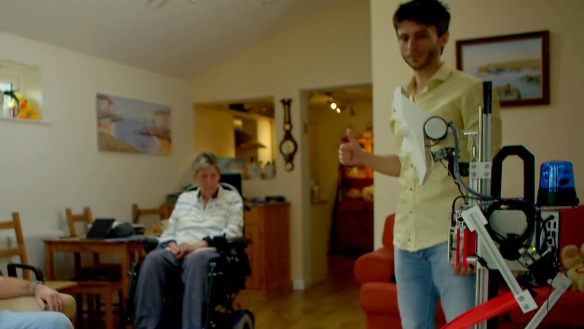 Care assistant robot, Carebot, shows its new owners Neil and Linda what it can do.