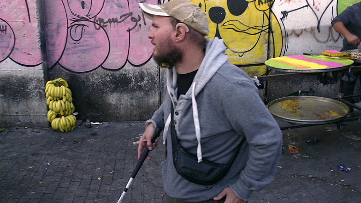 Completely blind and severely deaf backpacker Tony Giles continues his journey in the Middle East crossing into the Palestinian territories and visiting the Church of the Nativity in Bethlehem, where Christians believe Jesus was born.