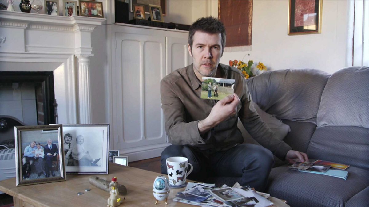 Rhod Gilbert looking through family photographs