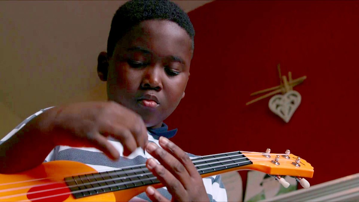 John plays a tune on the ukelele whilst growing up around stress and poverty