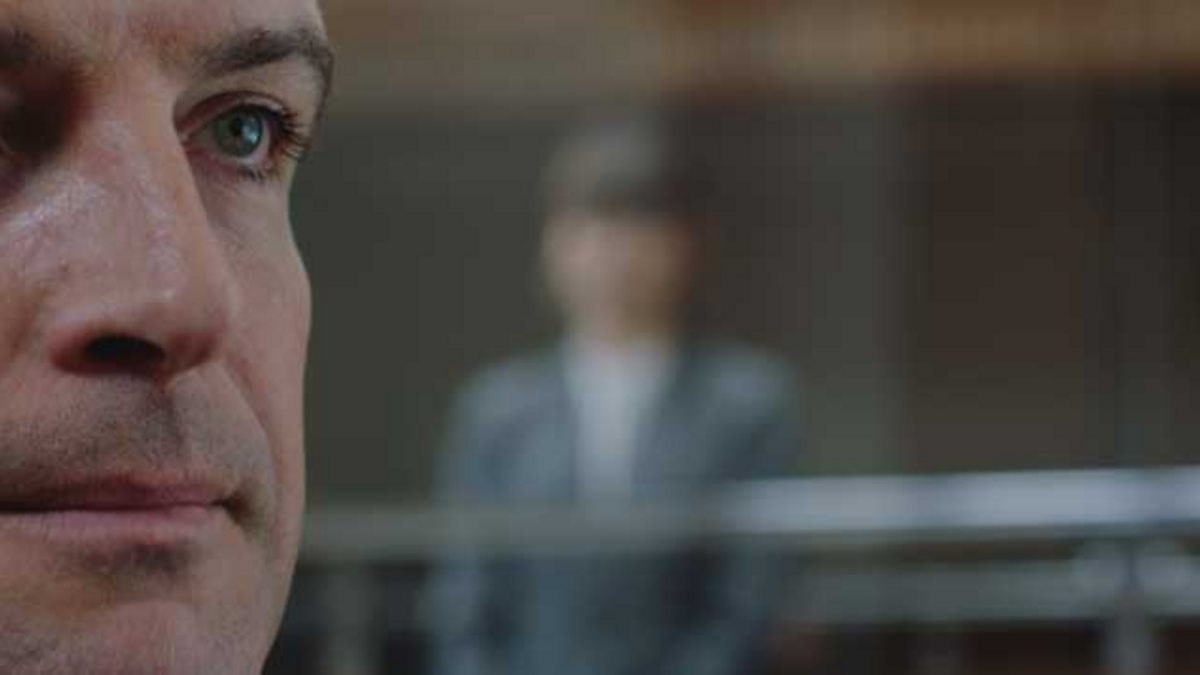 Evan (Bradley Freegard) defends Erin Glynn (Lowri Palfrey) in a murder trial. The victim's widow (Angeline Ball) watches with interest.