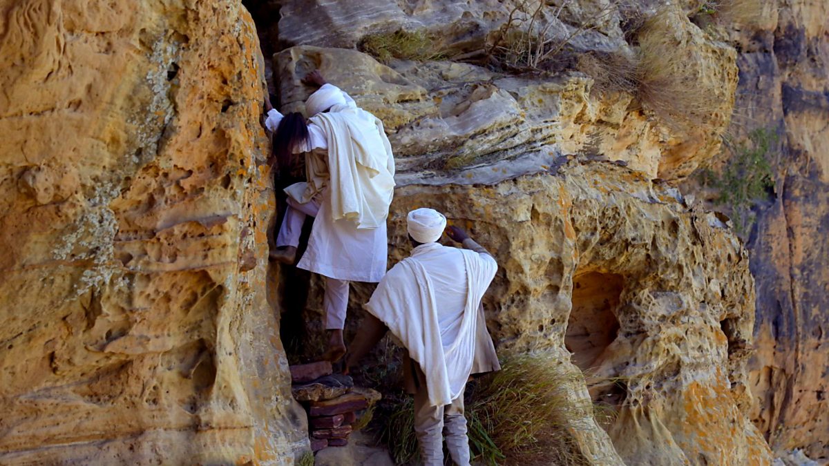 In Ethiopia’s Gheralta mountain villagers climb sheer cliffs for a baptism. Their churches are built high in the mountains to bring them ‘closer to God’