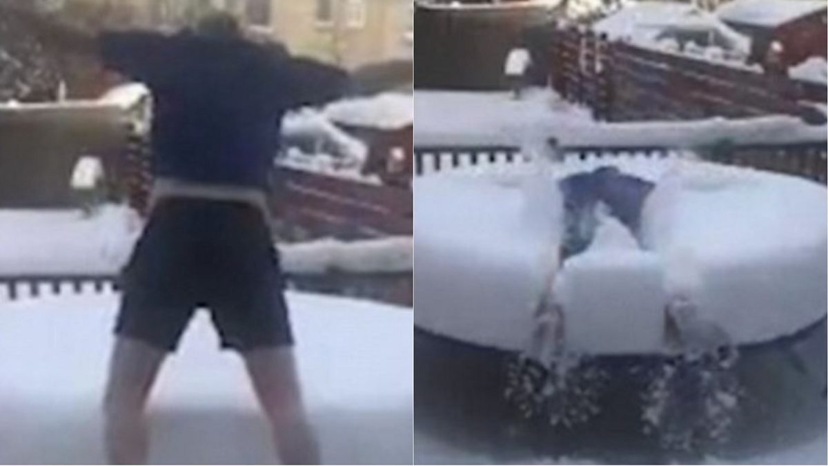 Man dives into thick layer of snow on trampoline