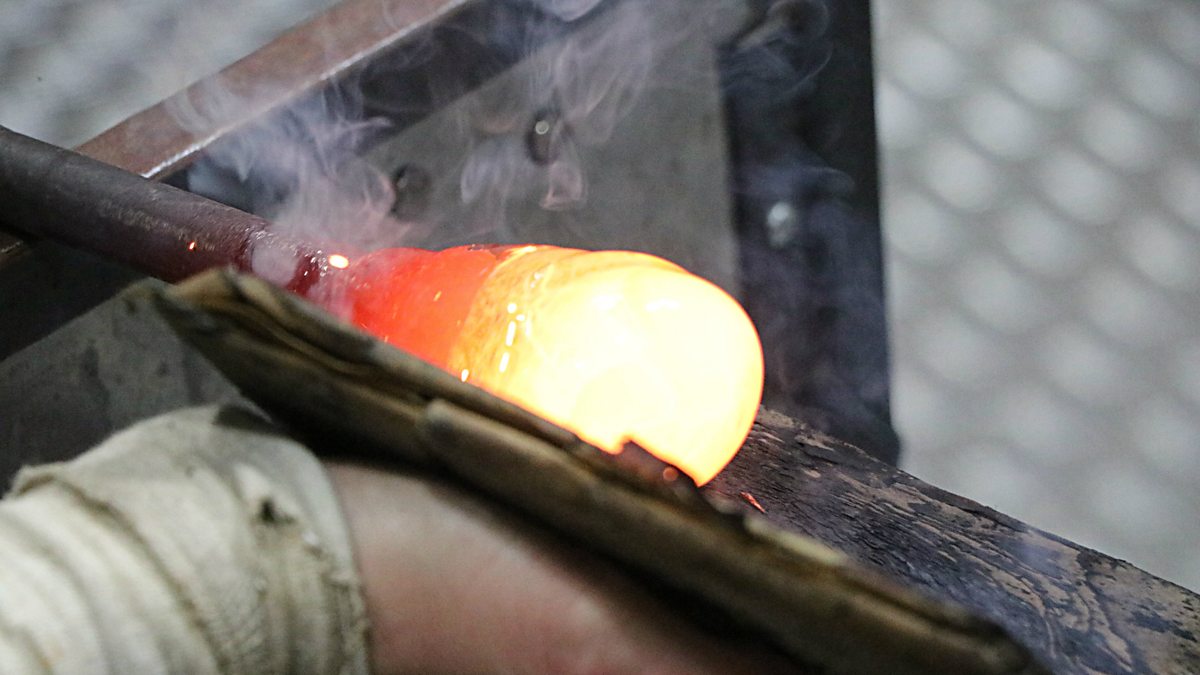 Helen is making glass infused with breast milk in the hot shop.