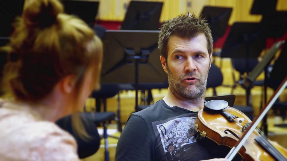 Rhod has his first lesson with a violin to see if he would fit in the strings section of the orchestra.