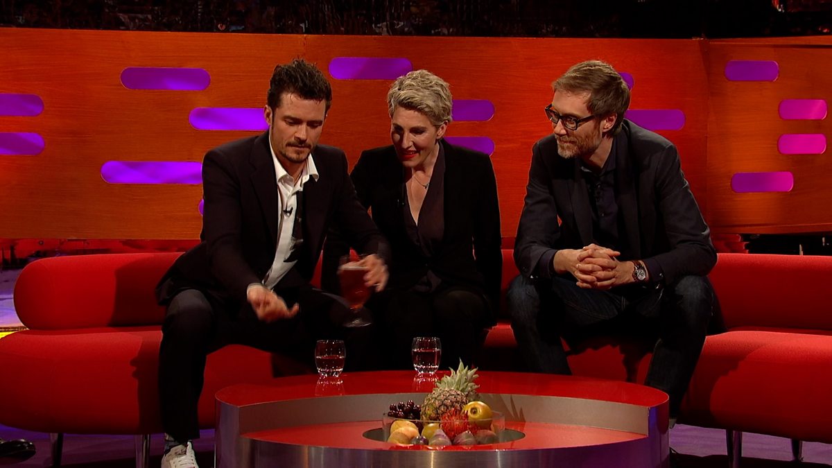 Orlando Bloom rescues a fly from Stephen Merchant's beer and Tamsin Greig worries about the continuity when a new one arrives with foam on top.