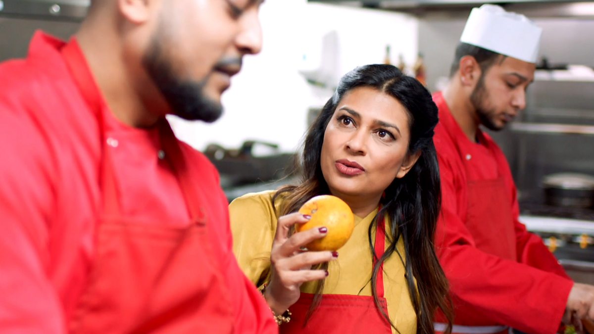 Afruj shows Nisha and his students how to use shatkora, a Bangladeshi fruit, to bring out a new depth of flavour in a beef curry.
