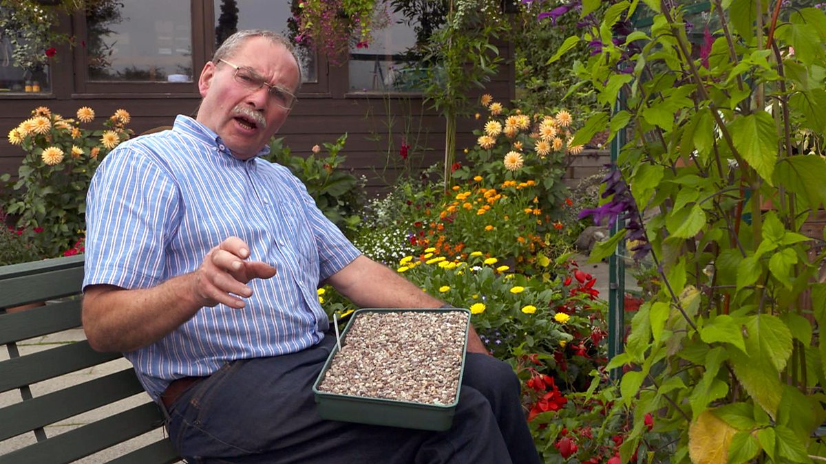 George proudly shows us the tiny shoots of meconopsis betonicifolia. Meanwhile, Jim responds to a viewer’s query: why does he always take the leaves off tomato plants?