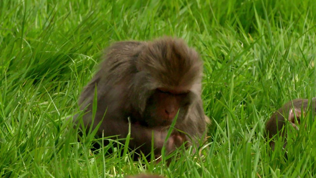 A troop of rhesus macaques enjoy a scatter feed, a cute baby tries to copy Mum.