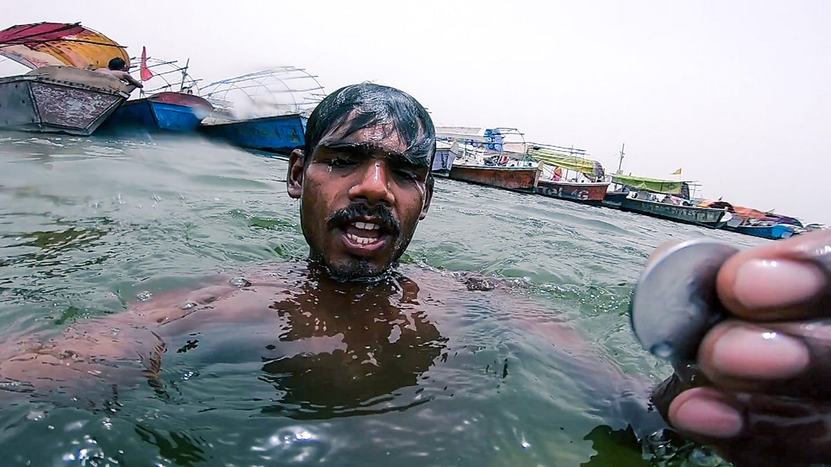 Fishing for coins in the Ganges river to survive.
