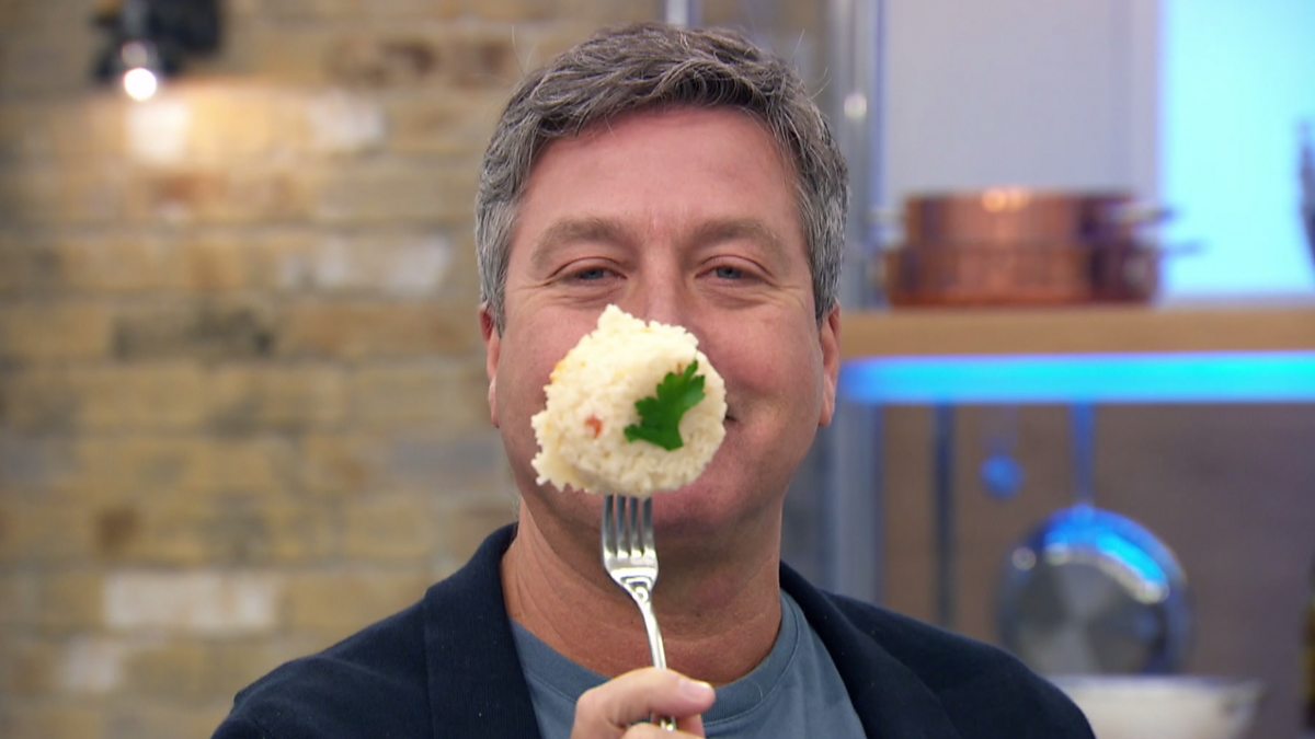 Michelle offers up her rice to John and Gregg...with a knife and fork.