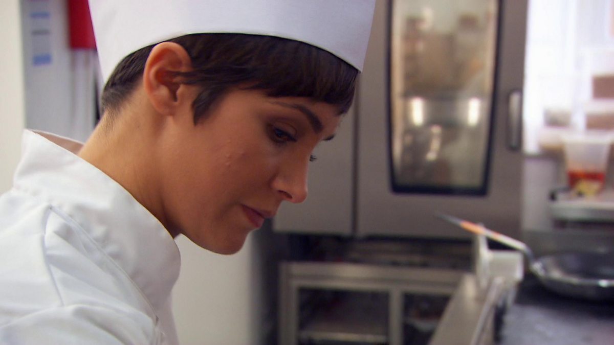 Frankie Bridge struggles with the plating up of her salmon dish, while Spencer Matthews finds his guinea fowl dish too hot to handle.