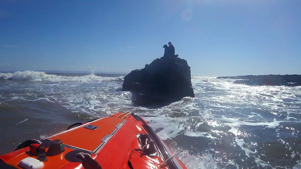The Porthcawl lifeboat crew must race to the rescue of two teenage boys stranded on a rocky outcrop before they're swept off by breaking waves and a fast-rising tide.