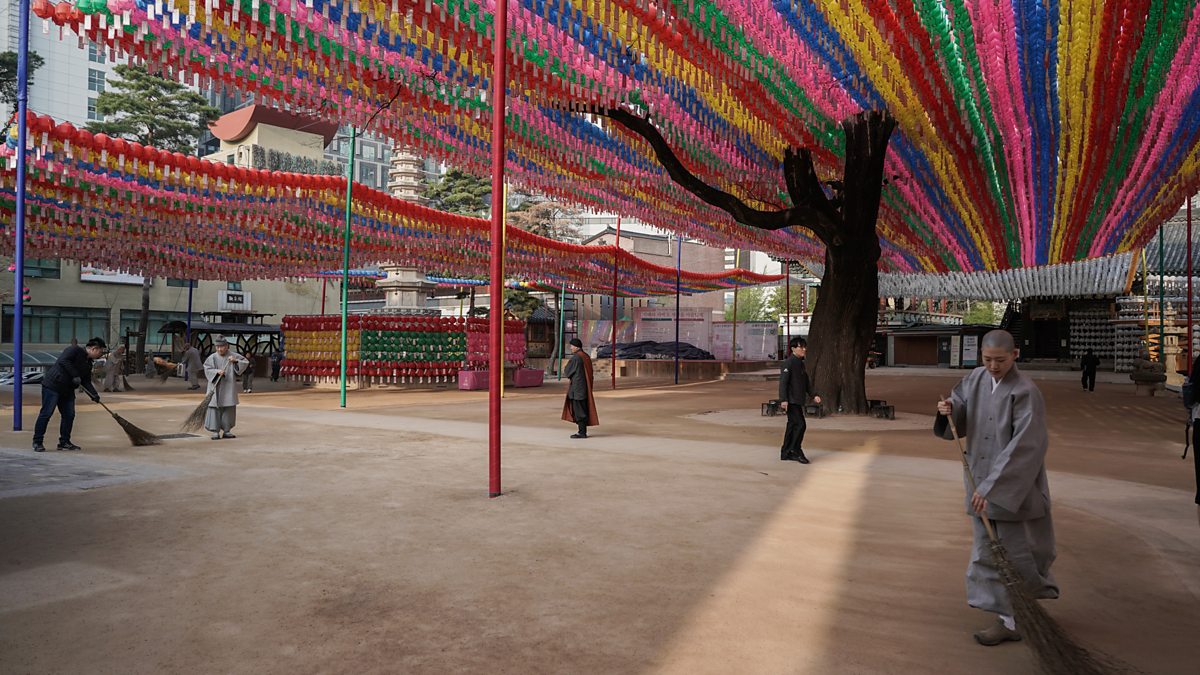 (Image: Monk sweeping at a Buddhist temple. Credit: BBC)