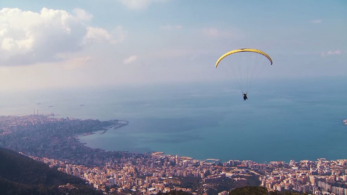 Simon Reeve paraglides over Lebanon’s Mediterranean coast.