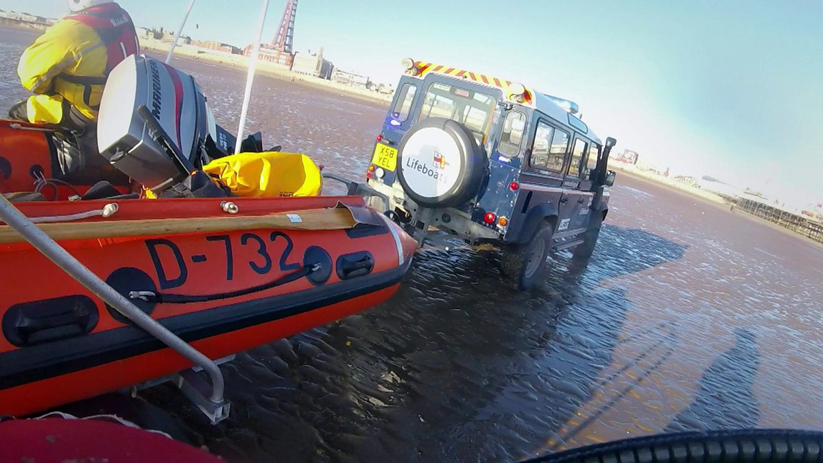 The Blackpool crew search for two people in trouble at sea, a girl who has been blown off shore on an inflatable boat and her father who swam out to try and rescue her.