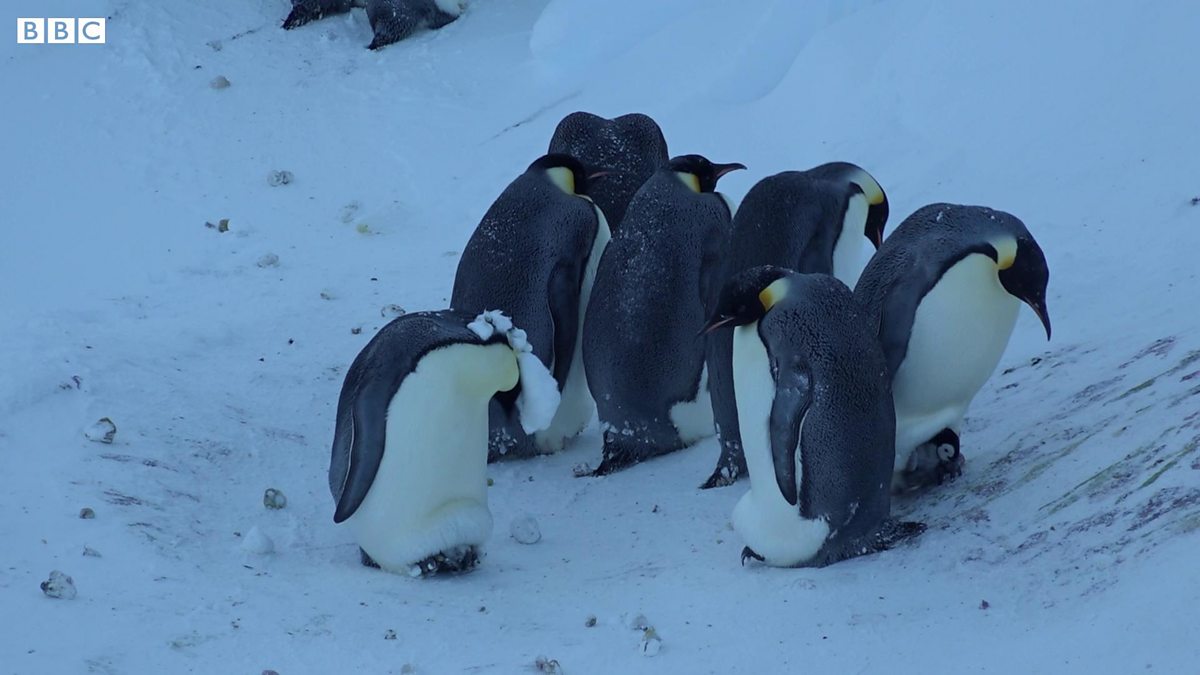 After an intense Antarctic storm, the film crew find a group of penguins trapped inside a gully. With no way out, the crew cut steps in the ice for the penguins to escape.