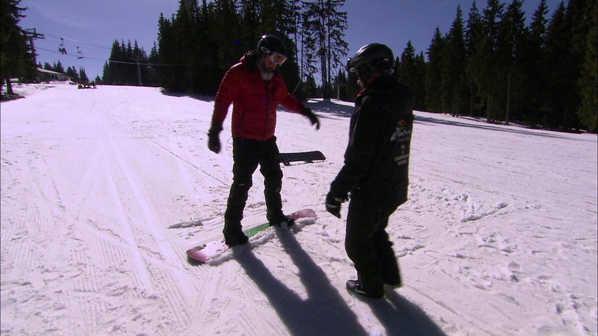 Joe gets a snowboarding lesson.