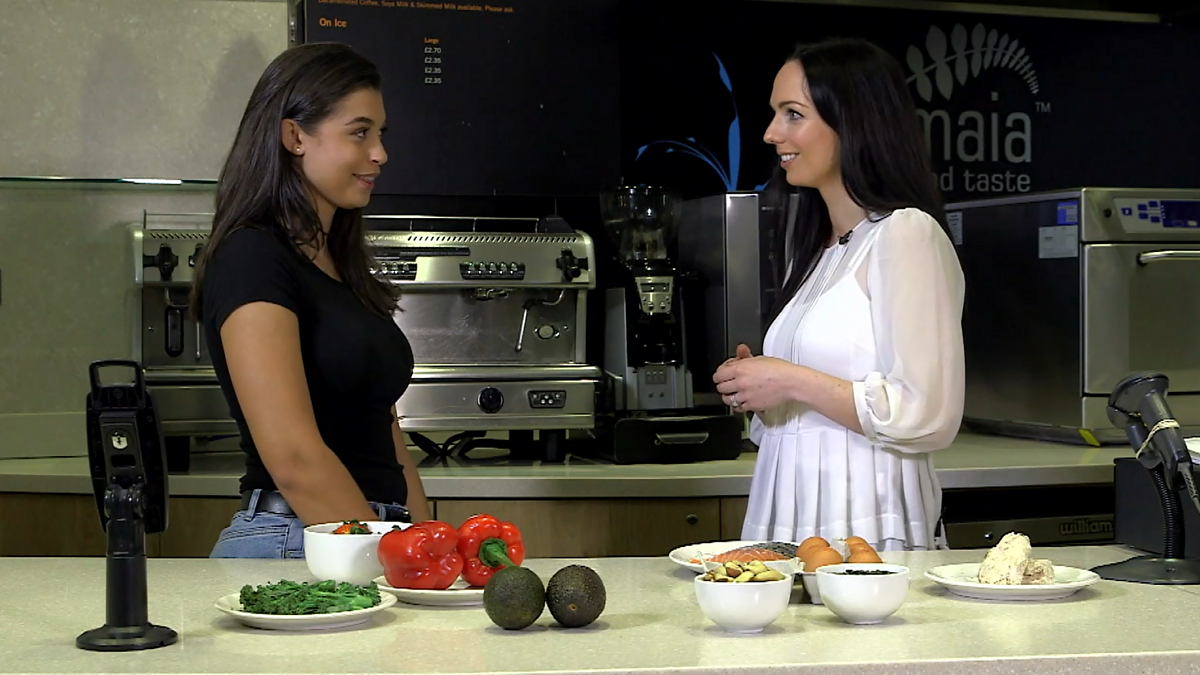 Nicola Ludlam-Raine shows model Tia which foods are good for maintaining healthy hair.