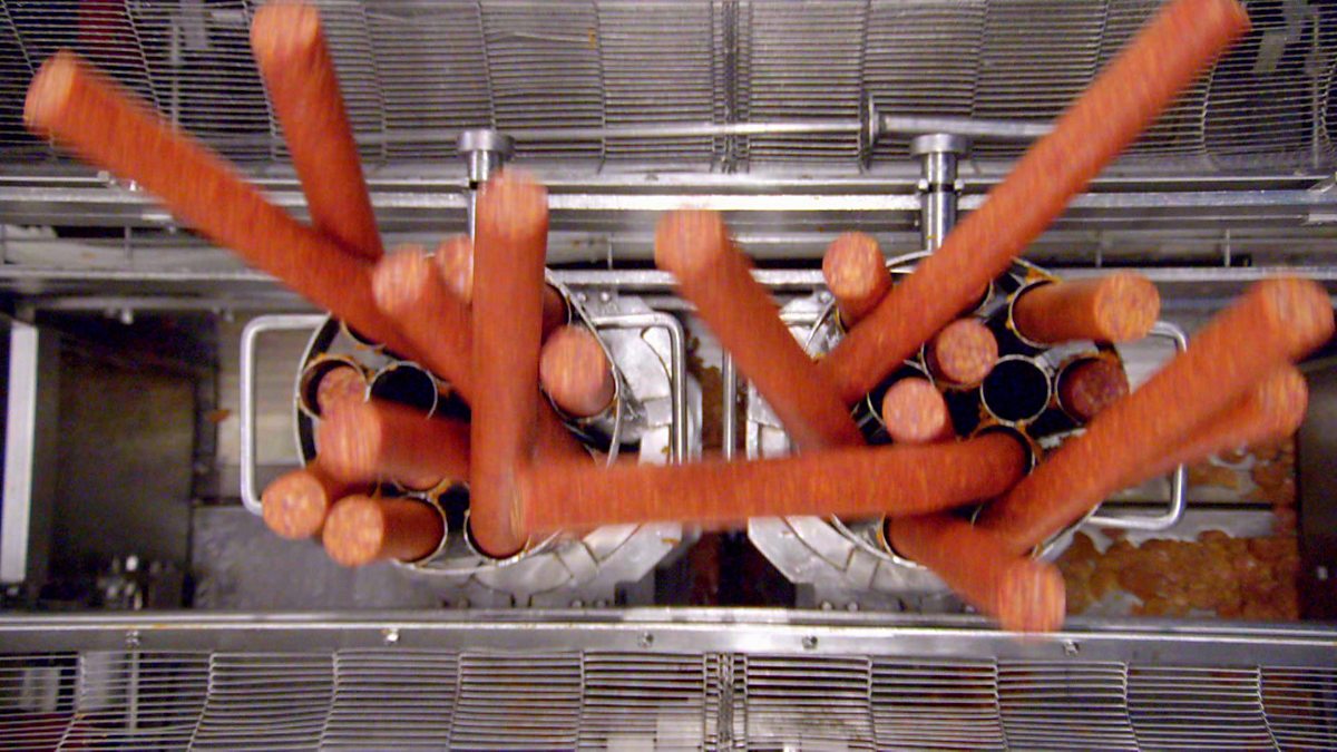 Gregg Wallace sees a machine which precisely slices 1 metre long sticks of pepperoni onto pizzas