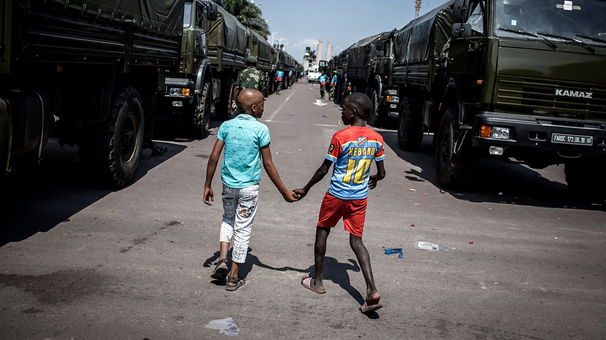 Image: Young Congolese boys walk hand in hand between 150 military trucks.