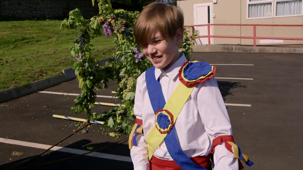 A procession of Morris dancers and musicians playing traditional folk tunes pull the May Queen through the village in a decorated cart led by Barry, the Betsy of the Morris side.