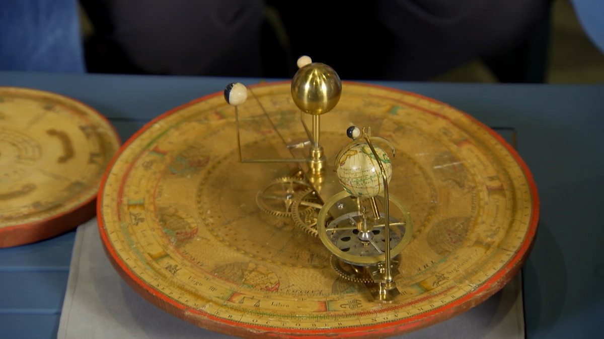 Clocks expert Ben Wright admires an 18th century Orrery depicting the solar system.