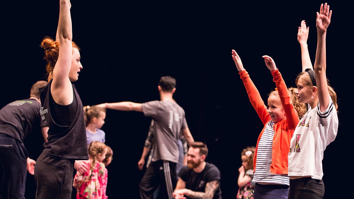 Local school children learn some dance moves from National Dance Company Wales' dancers.