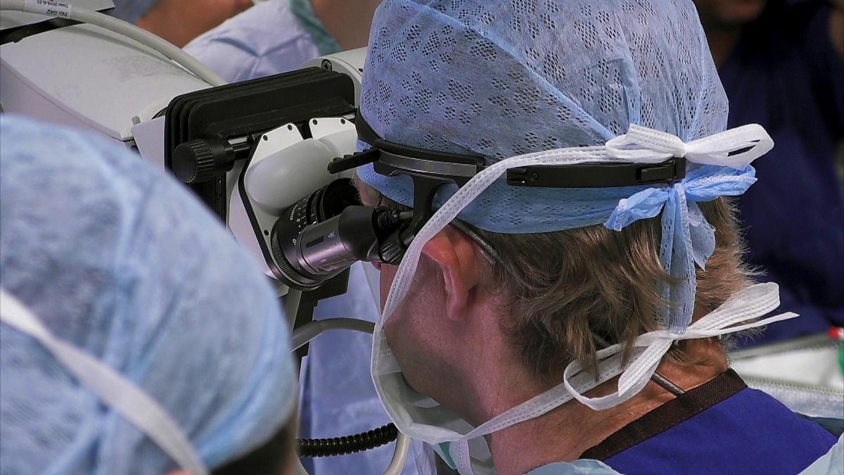 Consultant Maxillofacial Surgeon Tim Martin has to stitch the ends of two tiny blood vessels together while implanting a graft of bone from his patient's hip into her face.