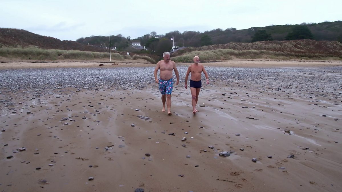 Derek the Weather dons his swimming trunks to plunge in to the sea on Gower…in November. He's joined by local man and poet Jim Young, who swims in the sea every day