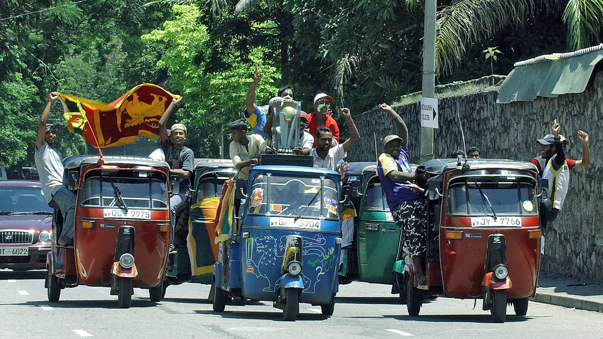 Photo: Sri Lankan cricket supporters wave national flags as they ride in a trio of rickshaws carrying a replica of the Cricket World Cup Trophy in Colombo (Getty Images)