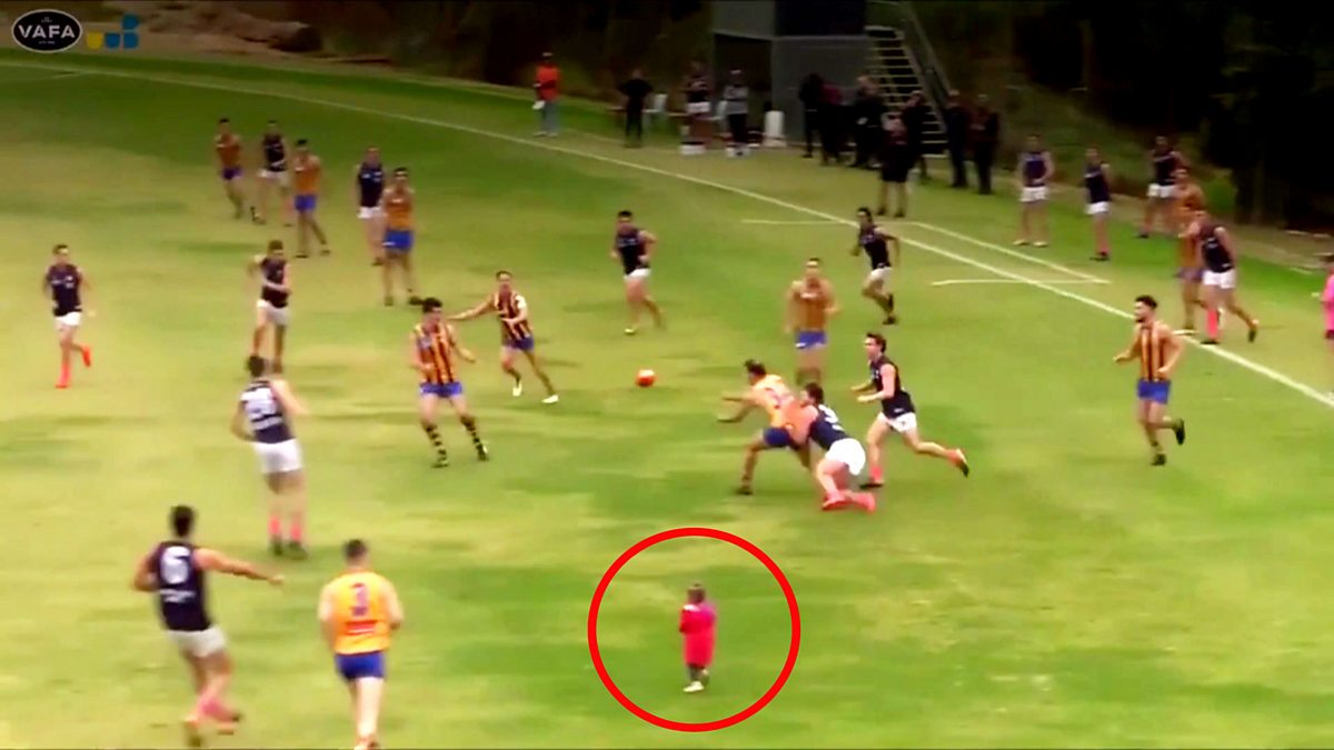 Two-year-old Pippa decided she wanted to be part of the action at an amateur Australian rules game in Melbourne. She was later reunited with her father.