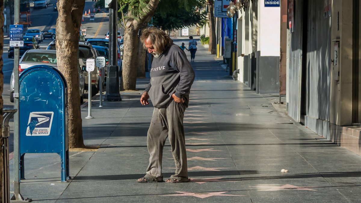 (Image: Homeless man on the Hollywood Walk of Fame. Credit: Getty Images)